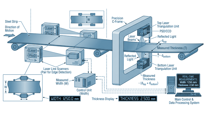 The geometry of a flat rolled strip—specifically its thickness and width—is the final verdict on quality control. Traditionally, these parameters are measured separately: a scanning micrometer for width and an X-ray or single-point laser for thickness. However, for high-speed rolling mills and slitting lines, a combined, non-contact solution using dual laser arrays is emerging as the gold standard for accuracy and efficiency.